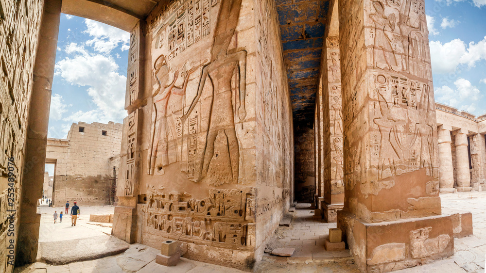 La ruta continúa con una vista panorámica del Templo funerario de la reina Hatshepsut, conocido como Deir el-Bahari, notable por su arquitectura en terrazas integrada en el acantilado.Posteriormente, visitaremos el Templo de Medinet Habu, construido por Ramsés III, uno de los templos mejor conservados de Egipto y de gran valor histórico y simbólico.